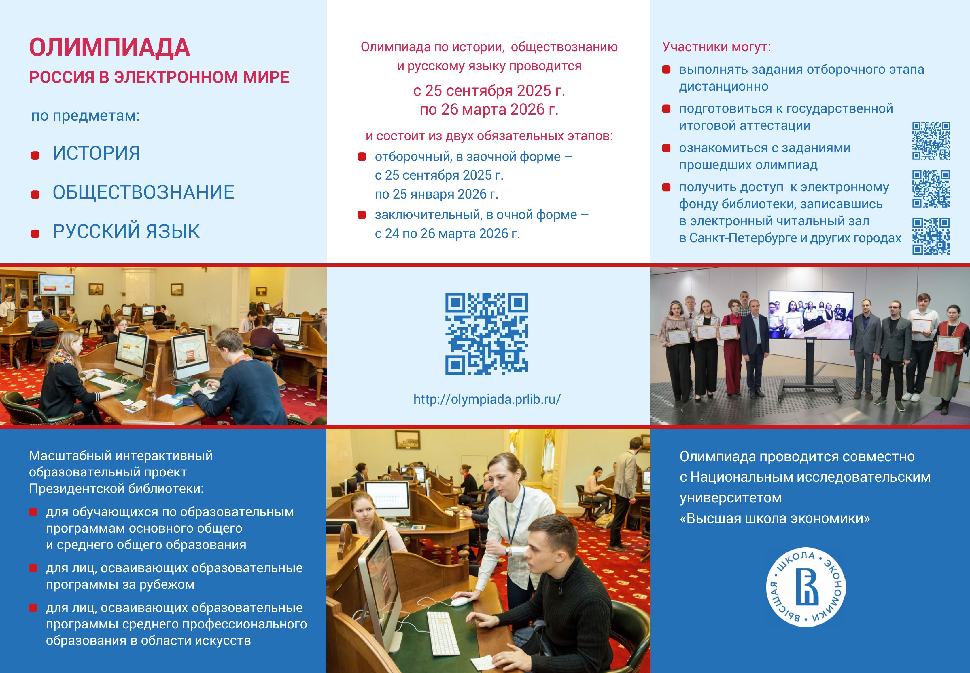 Президентская библиотека совместно с НИУ «Высшая школа экономики» проводит олимпиаду школьников «Россия в электронном мире»