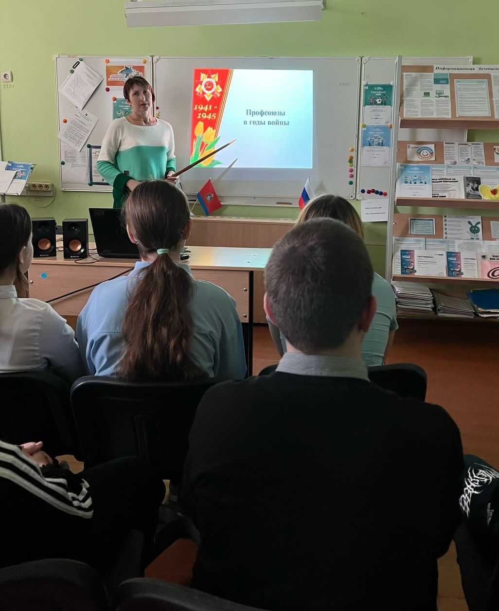 В нашей школе прошел Профсоюзный урок. Он был посвящен 80-летию Победы советской армии в Великой Отечественной войне. Урок провела председатель первичной профсоюзной организации нашей школы Ревина С.Н.. Великая Отечественная война вошла в историю как пример высочайшей силы человеческого духа, мужества, стойкости, героизма советского народа! Треть руководящих работников профсоюзов была призвана в Красную армию. Профсоюзы взяли на себя – организацию работы тыла, мобилизацию миллионных масс рабочих и служащих на выполнение заказов фронта, для помощи армии. Мы гордимся историей нашей страны и историей профсоюзного движения!