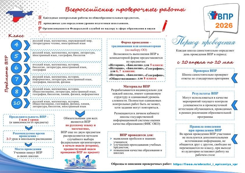 Все ВПР пройдут с 20 апреля по 20 мая 2026 года. Точные даты устанавливает школа самостоятельно.